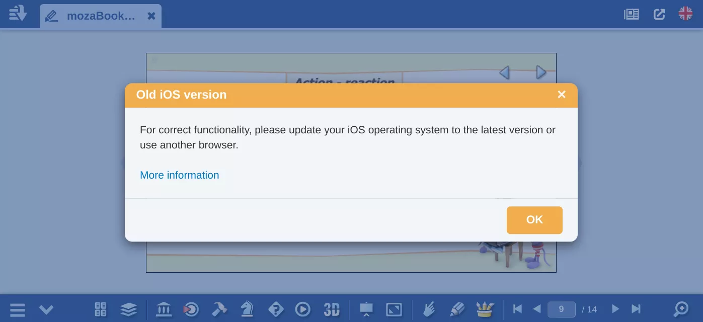 古いバージョンのiOSでは、教科書や小冊子のページを閲覧する際にエラーメッセージが表示される場合があります。その場合、まず以下のような警告画面が表示されます: