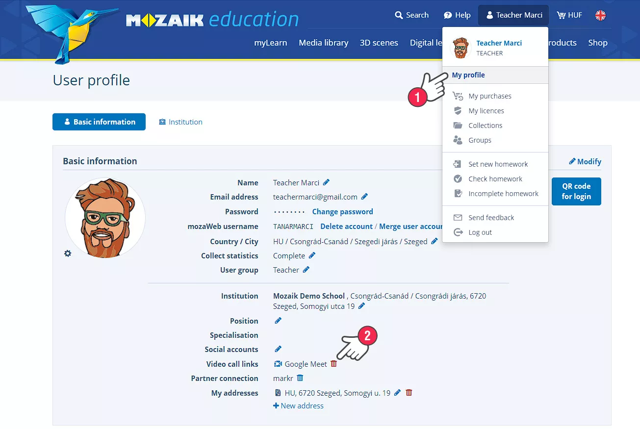 ビデオ会議を開始すると、mozaWebアカウントがログイン済みのビデオ会議サービスのアカウントに紐付けられます。この紐付けを解除し、別のビデオ会議サービスのアカウント(例:有料プランのアカウント)に接続したい場合は、マイプロフィール(1)の画面で、ビデオ会議接続の行にある該当サービスのゴミ箱アイコン(2)をクリックしてください。この操作を行うと、次回ビデオ会議を開始する際に新しいサービスへのログインが必要になります。(ビデオ会議接続の行は、いずれかのビデオ会議サービスに接続済みのアカウントがある場合にのみ表示されます。)