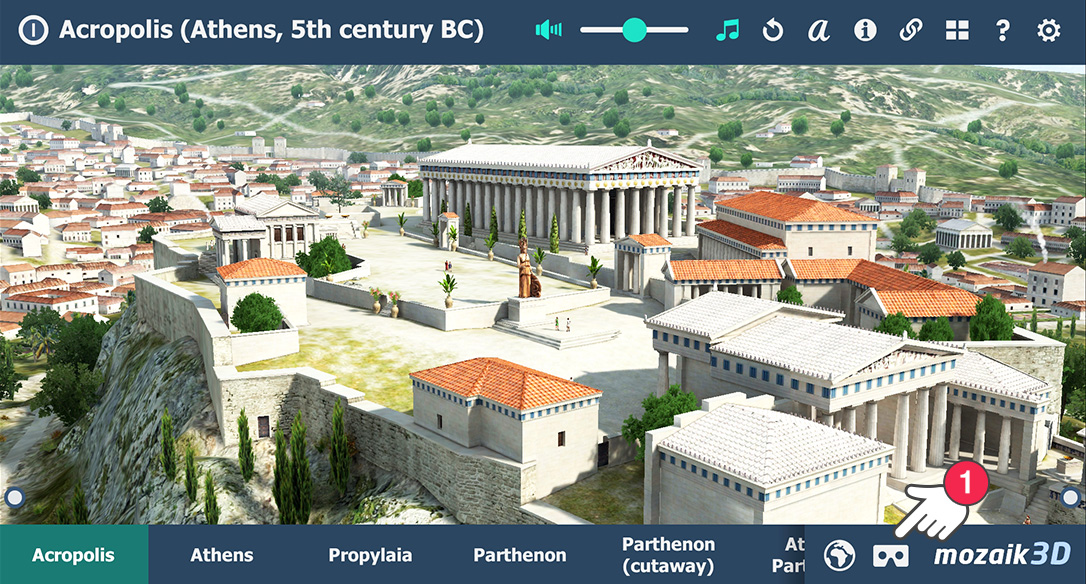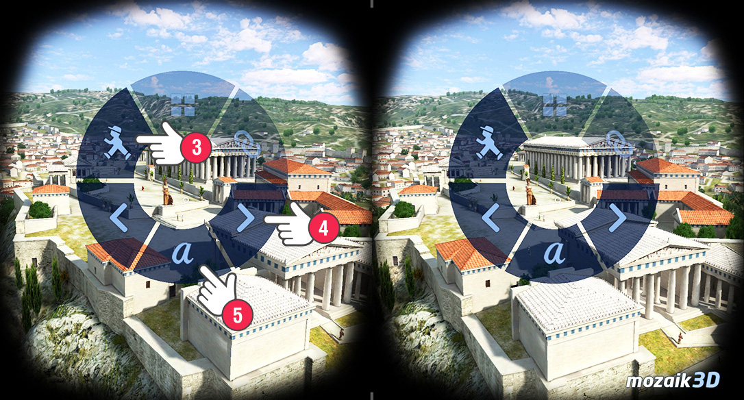 ほとんどの 3D シーンでは、VR ヘッドセットを使ってバーチャルウォークを体験することができます。そのためには、スマートフォンを装着できる VR ヘッドセットと、無料でダウンロードできる mozaik3D アプリが必要です。