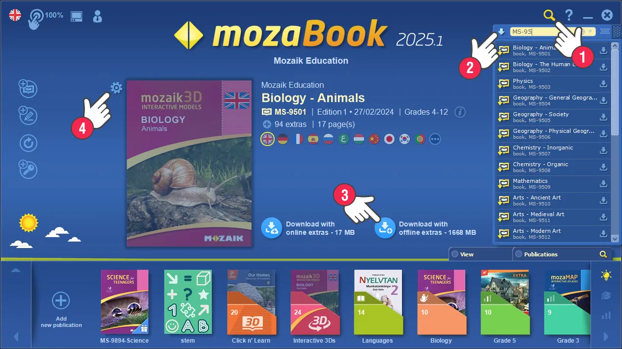 mozaBook のホーム画面で、画面右上の 虫眼鏡 アイコン (1) をクリックし、検索ボックスに「MS-95」と入力してください。矢印アイコン (2) をクリックすると、検索結果が画面下部に表示され、そこから自分の教科(例:物理、生物など)に関連する書籍のオフライン版を選択してダウンロードできます (3)。