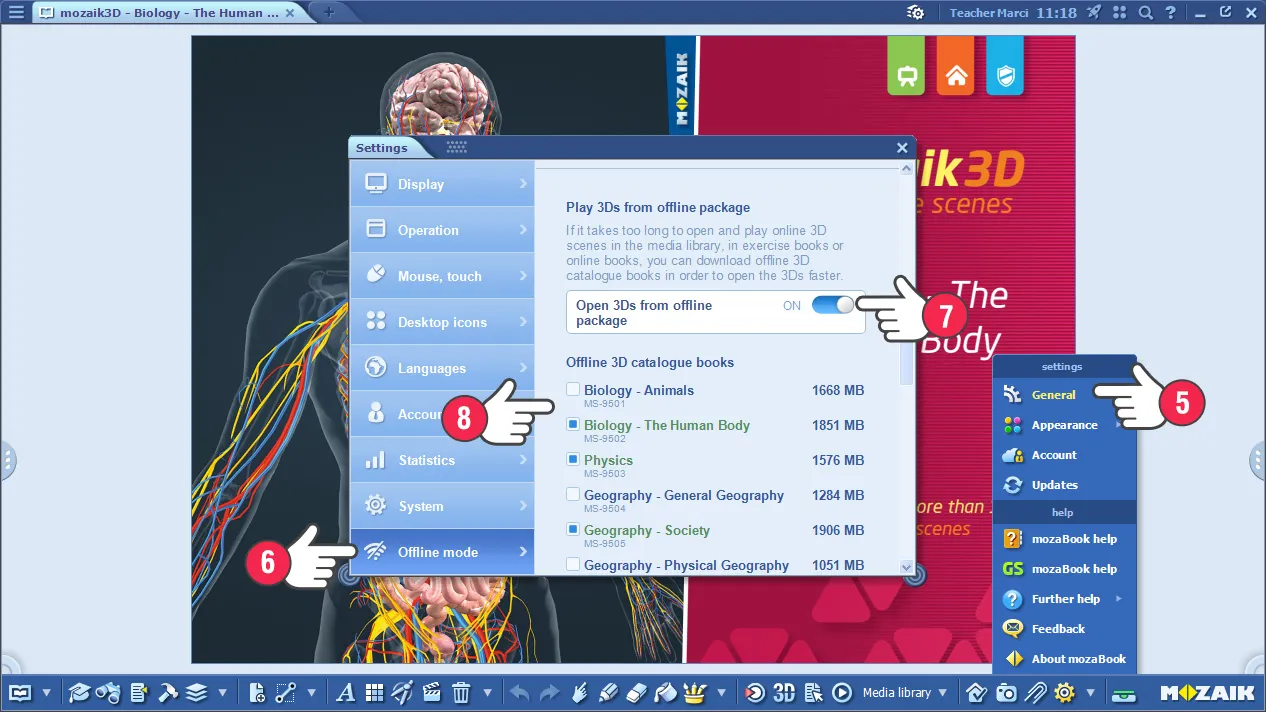 書籍を開いた後、設定 => 一般 (5) メニューを開き、表示されたウィンドウで オフラインモード (6) を選択します。3D 拡張機能をオフラインパッケージから再生 セクションまでスクロールし、スイッチをオンにしてください (7)。この画面では、どのトピックのオフライン書籍がパソコンにダウンロードされているかも確認できます。必要に応じて (8)、さらに書籍をダウンロードしたり、容量を空けるために削除することも可能です。
