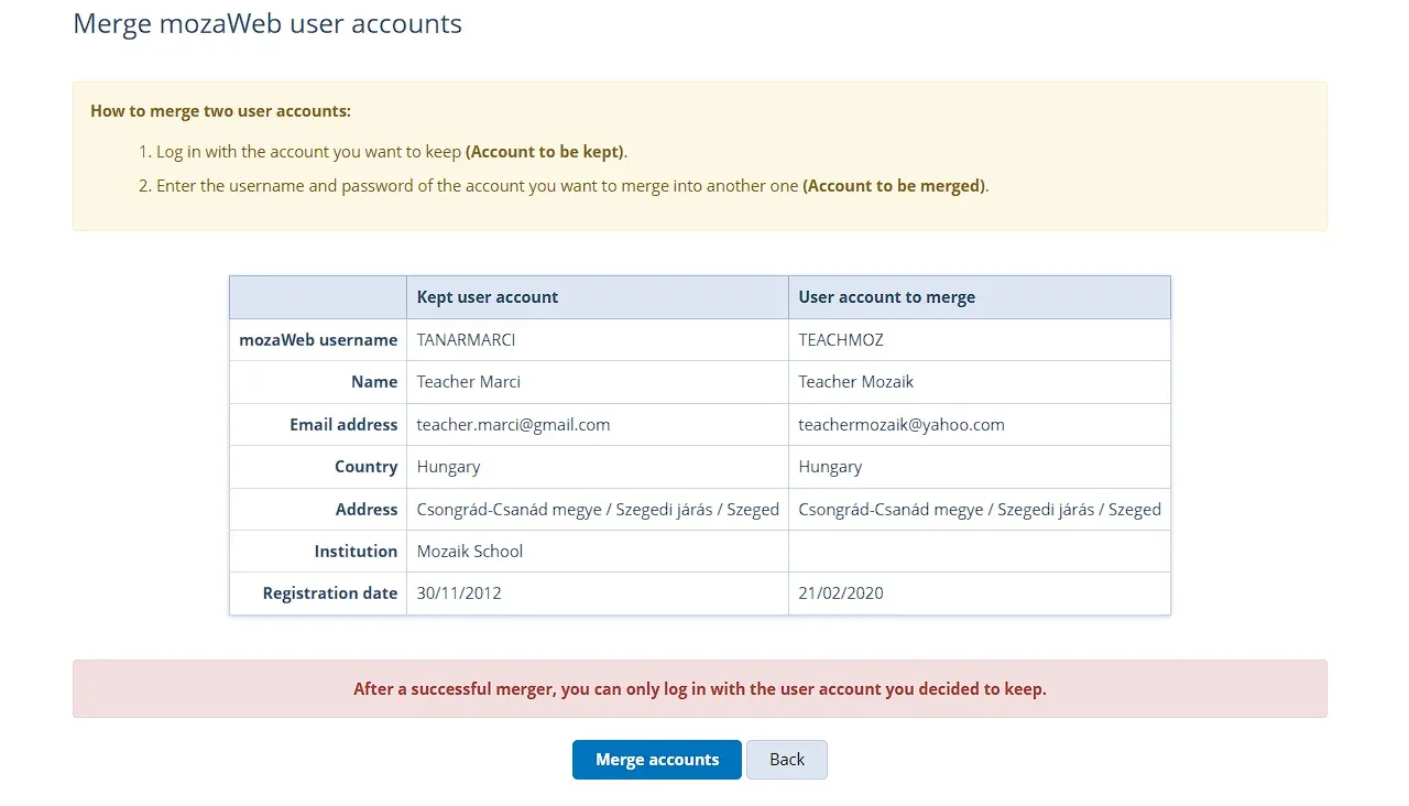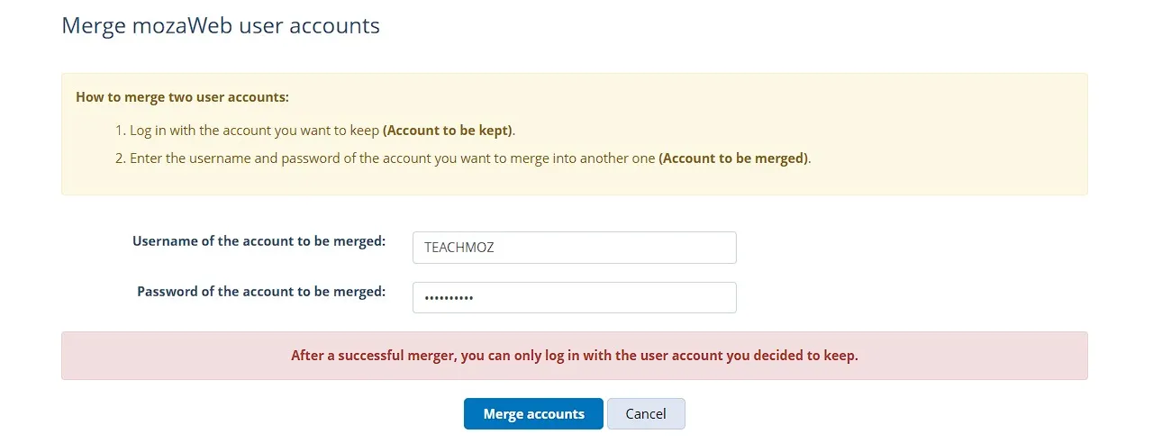 開いたフォームに、マージしたい(つまり終了させたい)アカウントの詳細(ユーザー名またはメールアドレス、パスワード)を入力し、アカウント統合ボタンをクリックします。