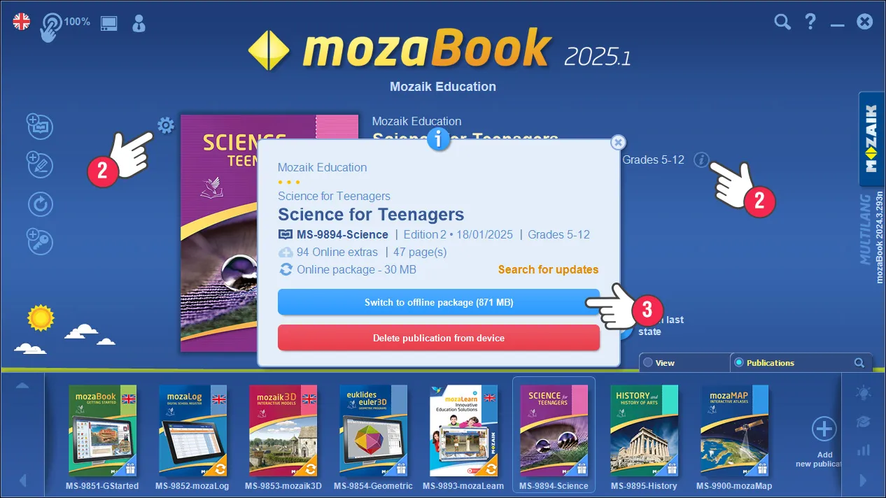 後からオンライン版が必要になった場合でも、もちろん引き続き利用可能です。その場合は、書籍の横にある歯車アイコン、または反対側にある (i) 情報ボタン (2) をクリックし、オフラインパッケージに切り替え オプションを選択してください (3)。