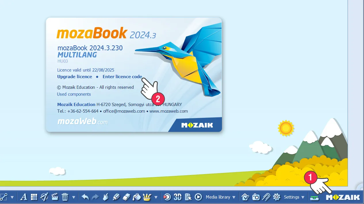mozaBookにログイン後、ツールバーのMozaikロゴ(1)をクリックします。表示される情報ボックスでライセンスコードの入力 (2)オプションを選択します。
