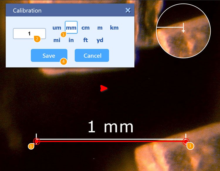 크기 보정|보정을 사용하면 기준 개체를 바탕으로 측정할 수 있습니다. 크기를 알고 있는 개체를 카메라 앞에 놓고 보정 버튼을 클릭합니다. 그 다음 알고 있는 부분의 시작점과 끝점을 표시하고 값과 측정 단위를 지정합니다. 이제부터 모든 측정값이 지정된 부분을 기준으로 계산됩니다. |
