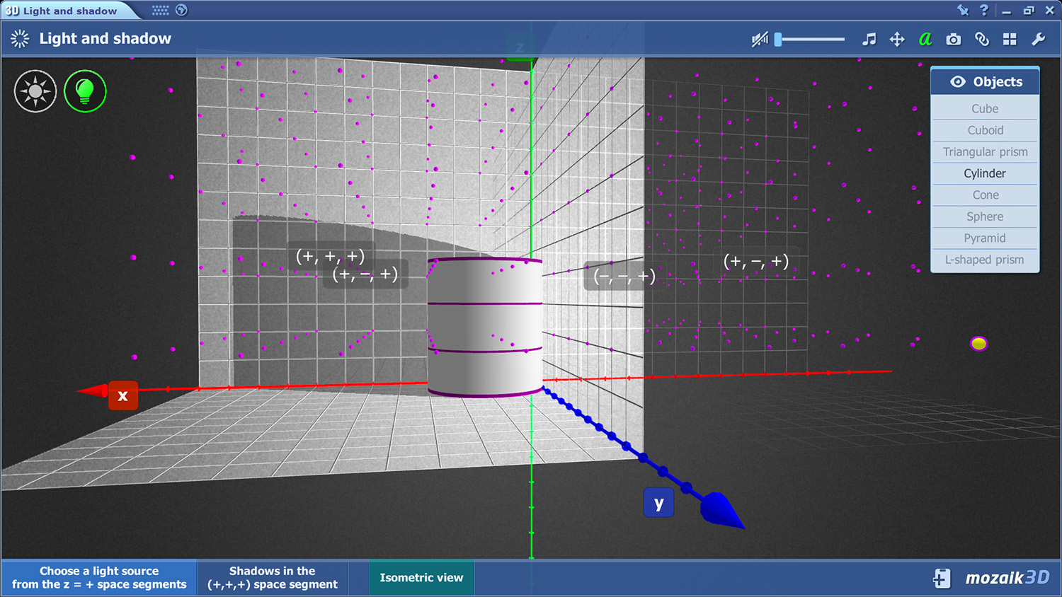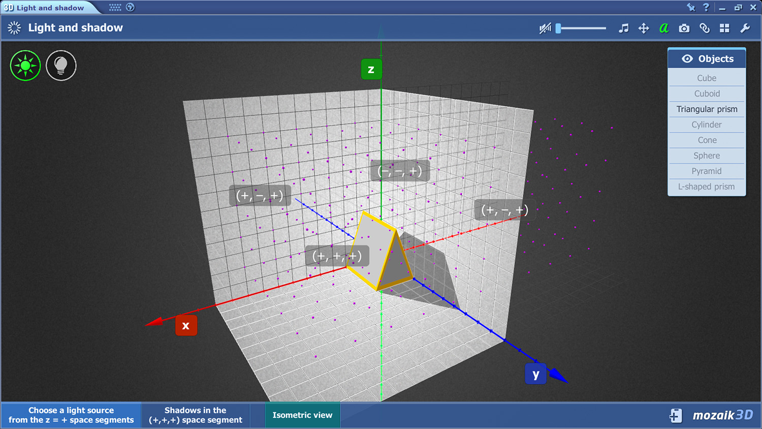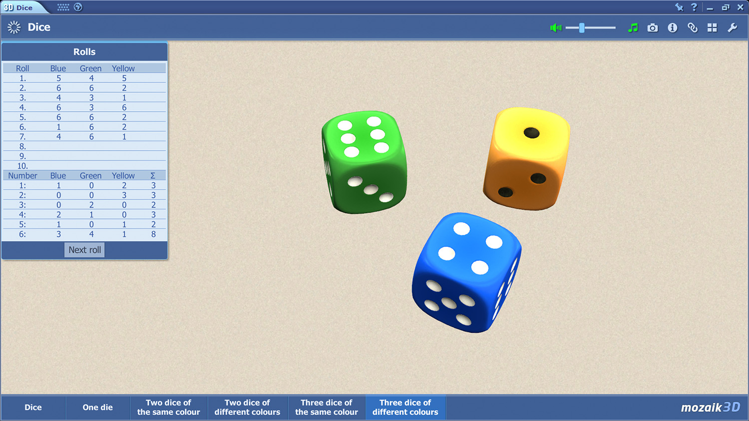 In another model, Light and shadow (below), the user can experiment by placing a light source near different spatial shapes in a room which is actually a 3D coordinate system. Depending on the type of light source, its placement and its distance from the shape, the shadow cast will differ dramatically. There are 8 different objects and two types of light to choose from in the coordinate system and the ability to rotate the 3D model and view the objects and shadows from different perspectives provides a great demonstration for students of art and physics alike.For statistics and probability (besides the best tool in the world (probably!)), our Dice 3D model (below) offers great support. Here the user can roll with different numbers and colors of dice and, as they roll they receive a statistical chart summing up the results, showing us the essence of the rules of chance.